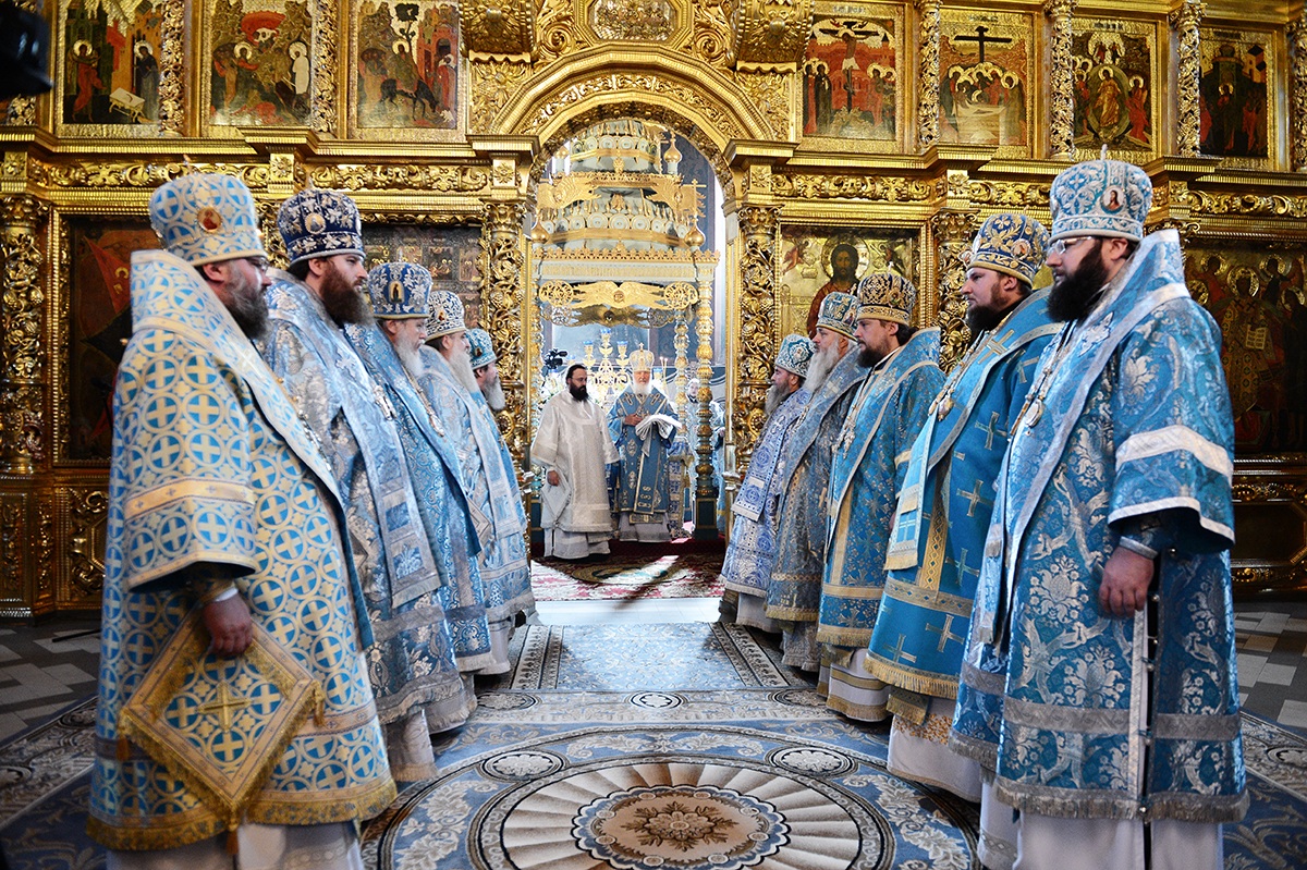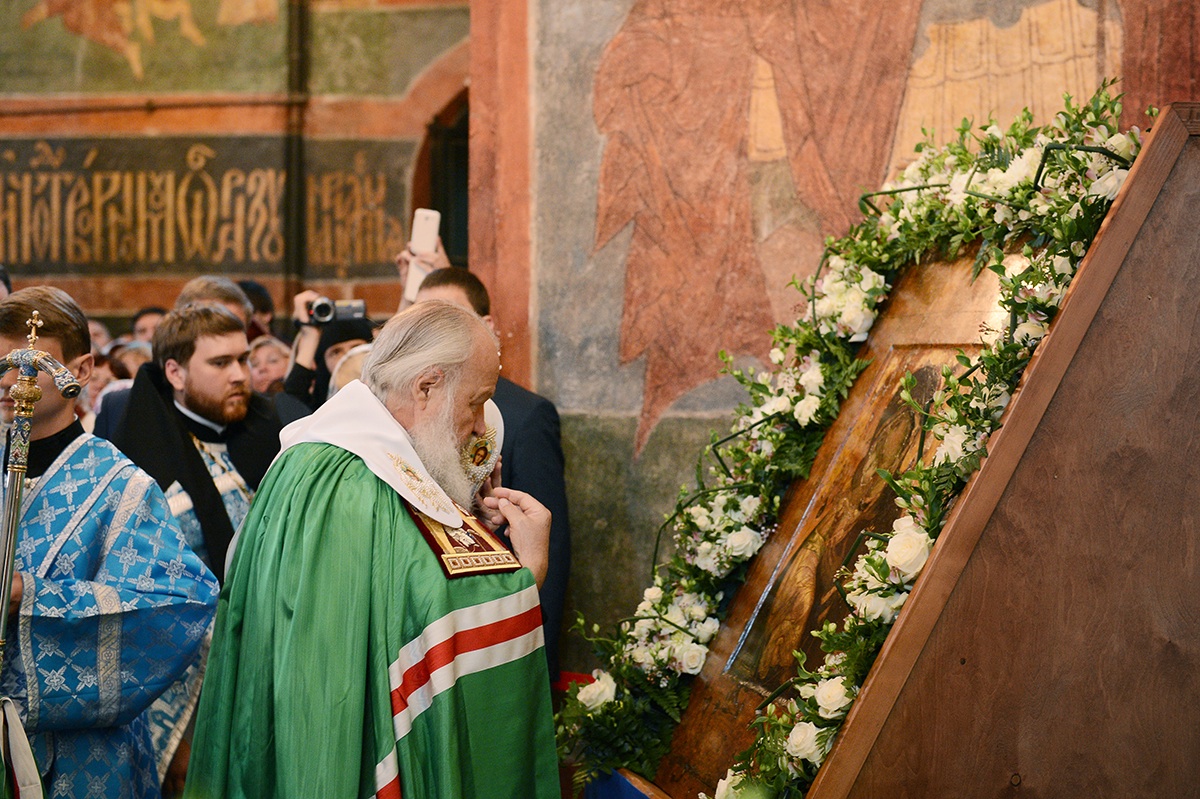 Во время богослужения Предстоятель Русской Православной Церкви совершил сугубое моление о мире на Украине и вознес молитвы об упокоении души новопреставленного Блаженнейшего митрополита Киевского и всея Украины Владимира.