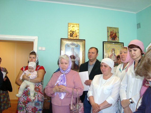 На освящении присутствовал главный врач детской больницы Игорь Леонидович Зайчик, медицинский персонал, мамы с малышами, которым по состоянию здоровья было можно покинуть свои палаты.
