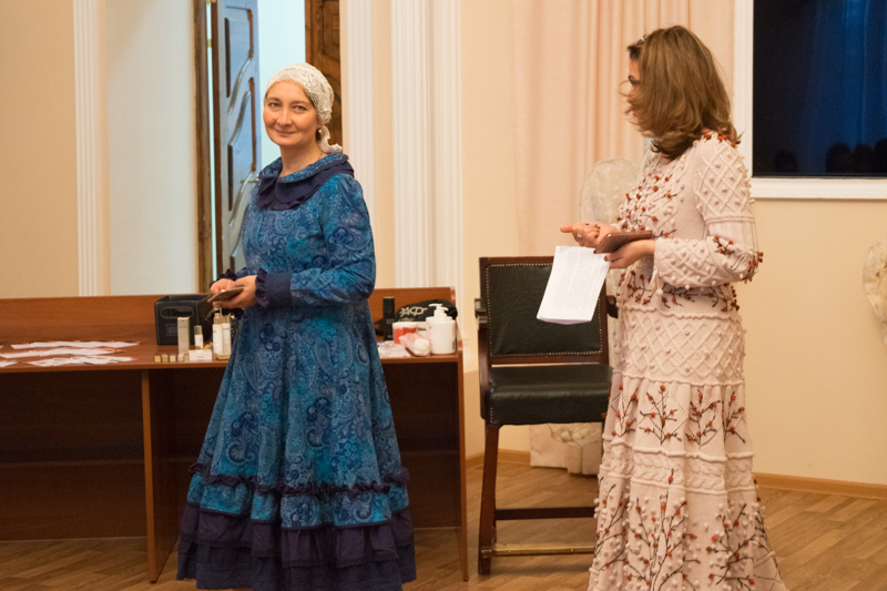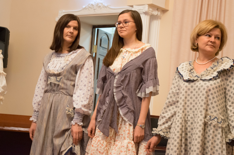 Ольга Рябова рассказала о многослойности русской одежды, об украшениях, натуральных тканях, кружевах и вышивке. Моделями на показе были обычные прихожанки и педагоги детской Воскресной школы.