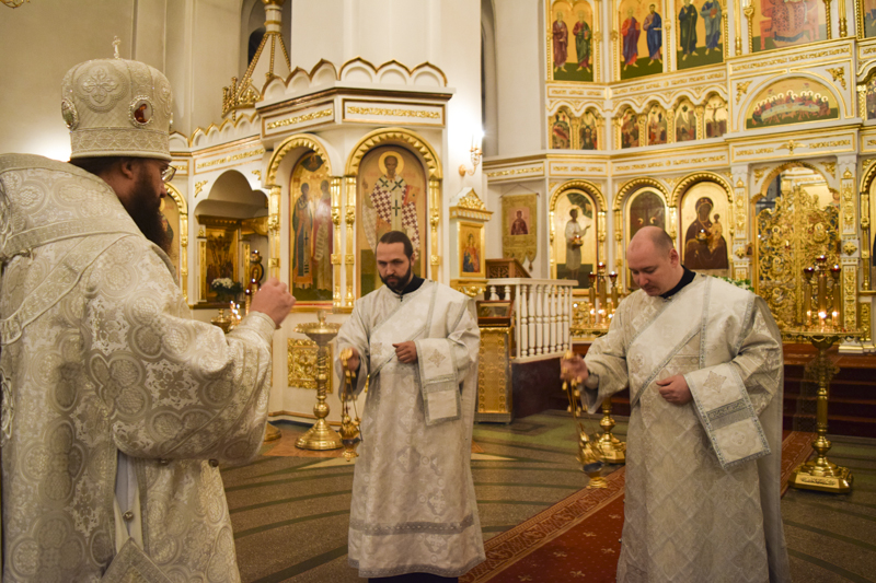 Его Преосвященству сослужили: секретарь Норильской епархии иеромонах Герман (Мельников); благочинный Норильского округа протоиерей Владимир Иванов; клирики кафедрального собора.