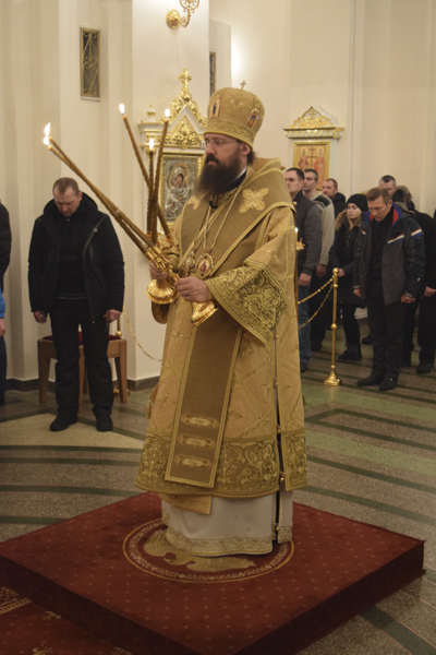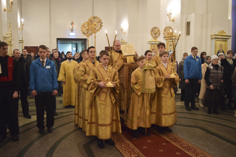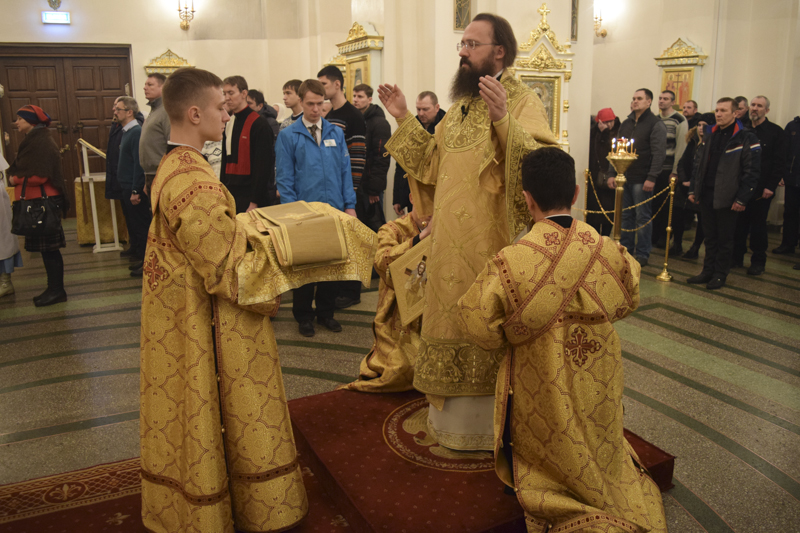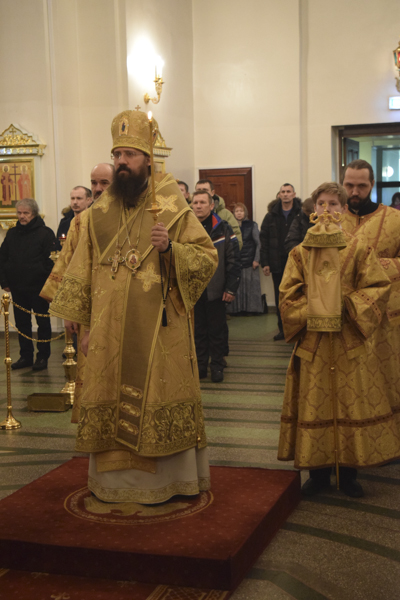 Его Преосвященству сослужили: секретарь Норильской епархии иеромонах Герман (Мельников); благочинный Норильского округа протоиерей Владимир Иванов; благочинный Таймырского округа протоиерей Георгий Ицков; настоятель Свято-Троицкого храма района Талнах города Норильска протоиерей Даниил Тихонов; председатель епархиального отдела по взаимодействию с вооруженными силами и правоохранительными структурами протоиерей Димитрий Харцых; соборное духовенство.