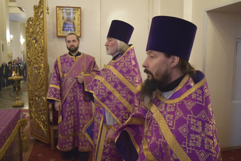 Его Преосвященству сослужили: секретарь Норильской епархии иеромонах Герман (Мельников), благочинный Норильского округа и ключарь кафедрального собора протоиерей Владимир Иванов, клирики кафедрального собора.
