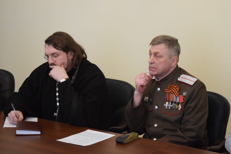 В совещании приняли участие: секретарь Норильской епархии иеромонах Герман (Мельников); руководитель епархиального отдела по взаимодействию с казачеством протоиерей Владимир Иванов; руководитель епархиального отдела по взаимодействию с вооруженными силами и силовыми структурами РФ протоиерей Димитрий Харцыз; благочинный Таймырского округа Норильской епархии, духовник казаков станицы Дудинской - протоиерей Георгий Ицков; заместитель руководителя епархиального отдела по взаимодействию с казачеством иерей Сергий Кузьменко; настоятель храма святителя Луки г. Норильска иерей Павел Бочков; Атаман Норильского городского казачьего общества, казачий полковник Кононенко Юрий Александрович; Председатель местной общественной организации «Союз ветеранов Афганской войны и локальных конфликтов» Шабурин Валерий Владимирович; представители Норильского казачества; сотрудники епархиальных отделов.