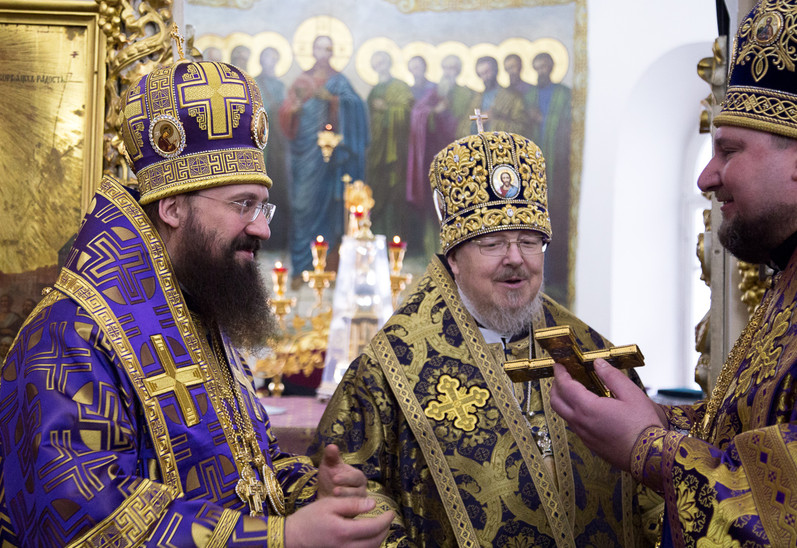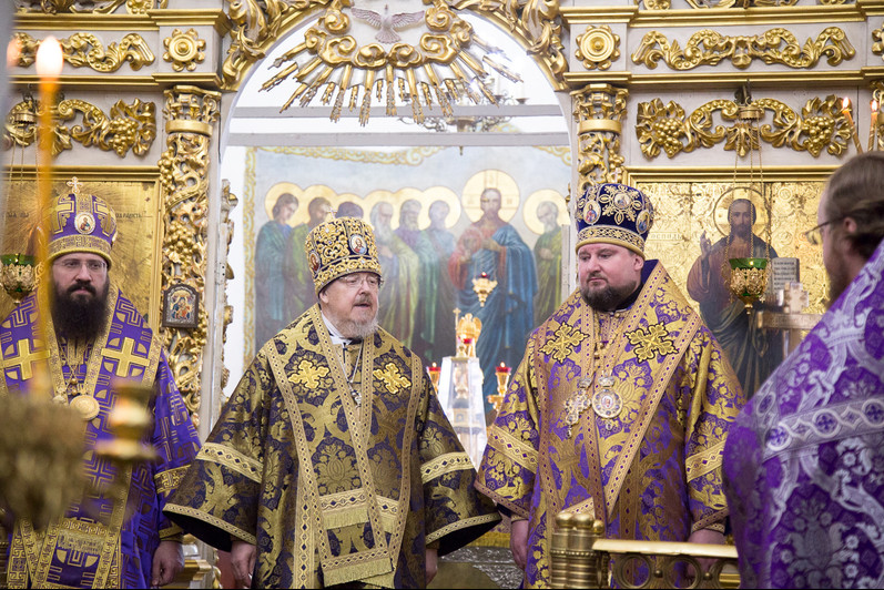За Литургией иерархам сослужили: исполняющий обязанности секретаря Красноярской епархии, благочинный церквей Левобережного городского округа Красноярска, наместник красноярского Успенского мужского монастыря игумен Иннокентий (Нилов); секретарь Канской епархии, благочинный Иланского округа церквей, настоятель Александро-Невского храма города Иланский протоиерей Георгий Князев; заведующий канцелярией Красноярской епархии, благочинный церквей Красноярского округа, настоятель Иоанно-Предтеченского храма Красноярска протоиерей Николай Ши-кэ-мин, благочинные церковных округов Канской епархии, штатные священнослужители Свято-Троицкого кафедрального собора и Покровского кафедрального собора Красноярска.