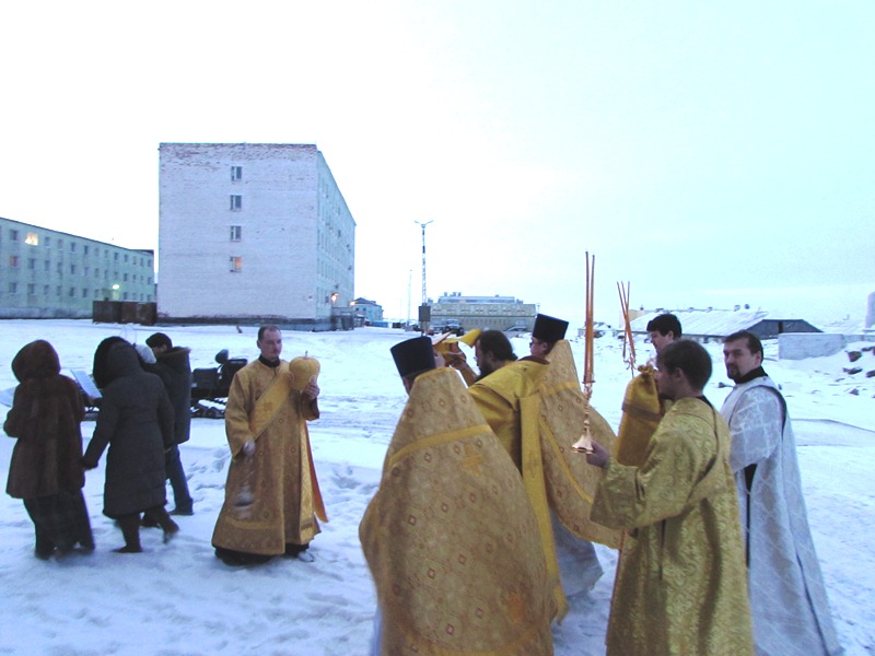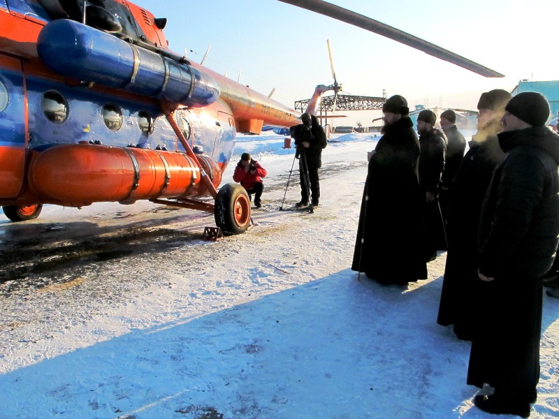 Архипастырский визит начался с молебна, который был совершен на взлетной полосе перед отправкой вертолета на Диксон.
