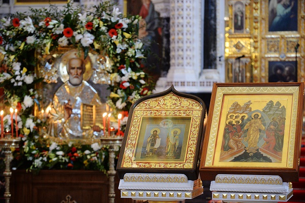 По прибытии в Храм Христа Спасителя Святейший Патриарх Кирилл поклонился честным мощам святителя Николая, находившимся у западных врат храма. Во время Божественной литургии продолжался доступ паломников к мощам.