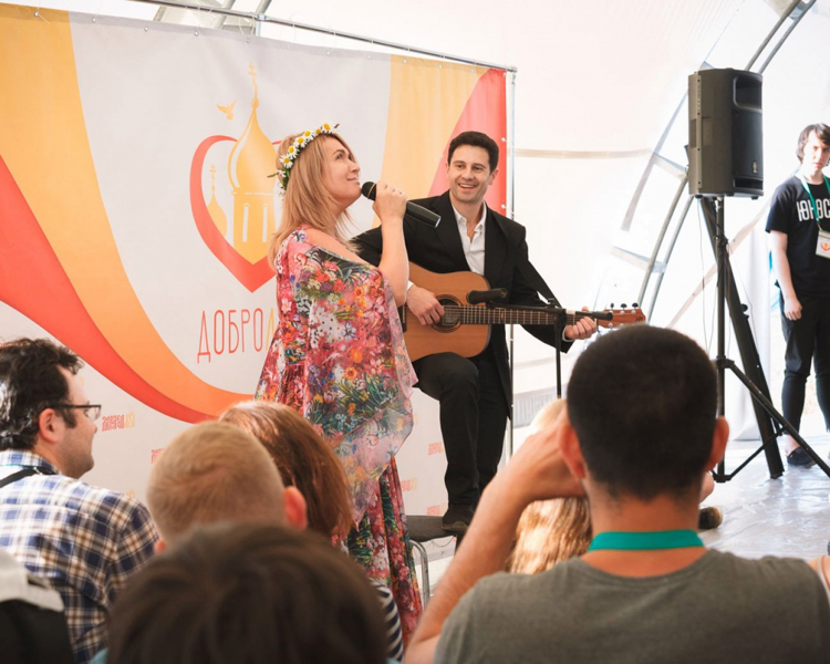 Ближе к вечеру Молодежный форум "Добролето" посетили Антон и Виктория Макарские. Артисты поздравили участников с открытием форума, спели несколько песен и рассказали, как они сами пришли к вере, в чем, по их мнению, состоит секрет счастья православной семьи и как можно изучать веру.
