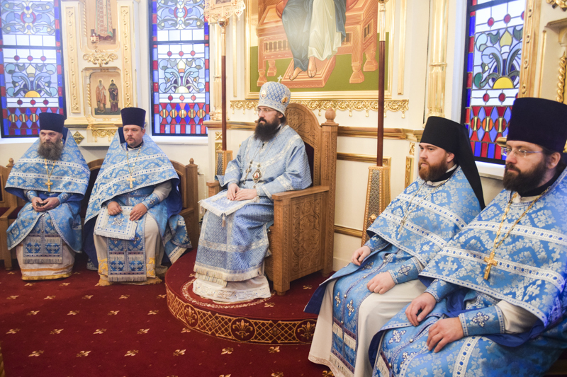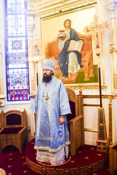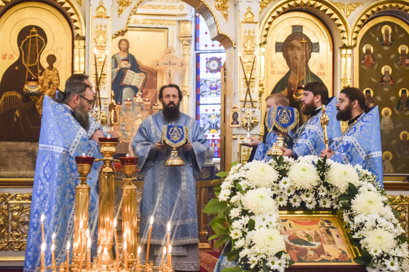 После причастия Архипастырь с духовенством кафедрального собора совершили славление перед иконой праздника.