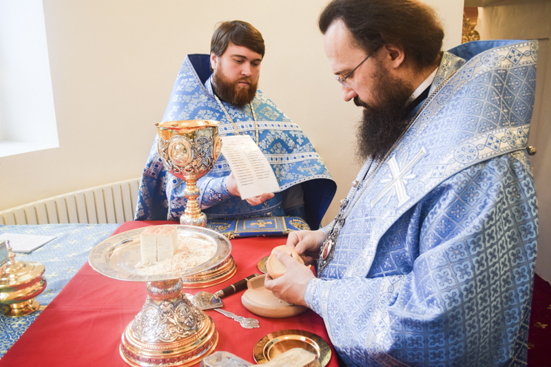 Его Преосвященству сослужили: секретарь Норильской епархии иеромонах Герман (Мельников); руководитель епархиального отдела по взаимодействию с силовыми структурами протоиерей Димитрий Харцыз; настоятель Покровского храма поселка Светлогорск иерей Александр Попов; штатный клир кафедрального собора.