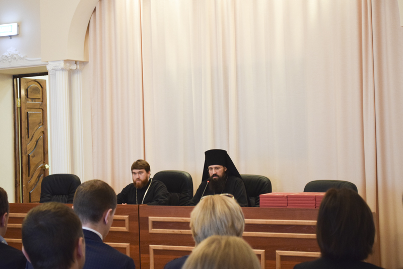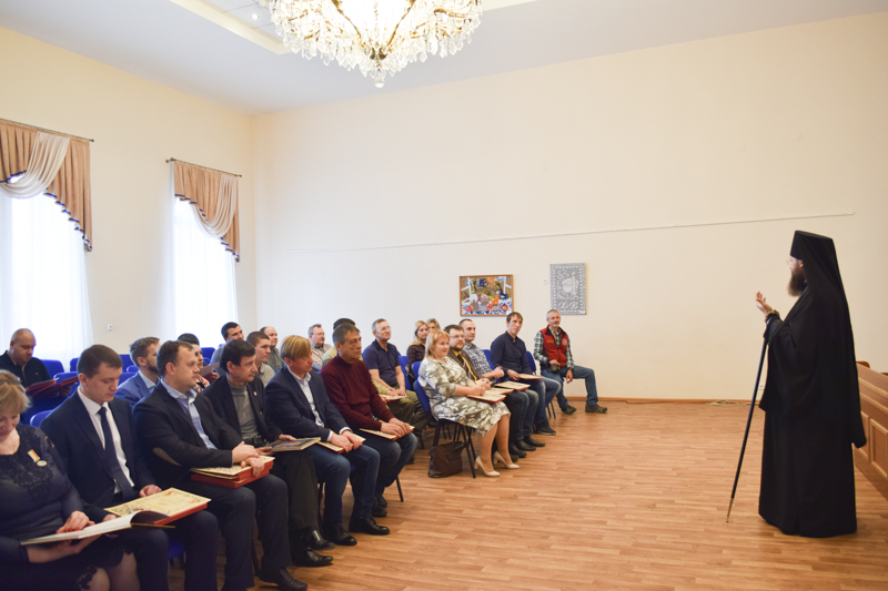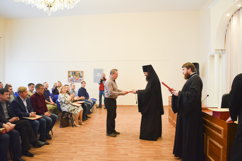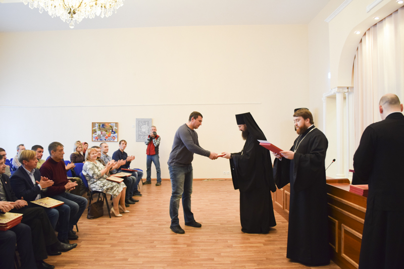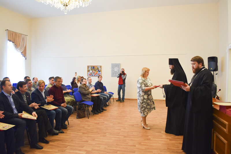 По приглашению Епархиального управления сотрудники организаций собрались в актовом зале Управления. К собравшимся обратился Владыка Агафангел и поблагодарил за понесенные труды и вклад в дело благоустройства и благоукрашения кафедрального собора. Архипастырь вручил собравшимся благословенные Архиерейские грамоты и памятные подарки.