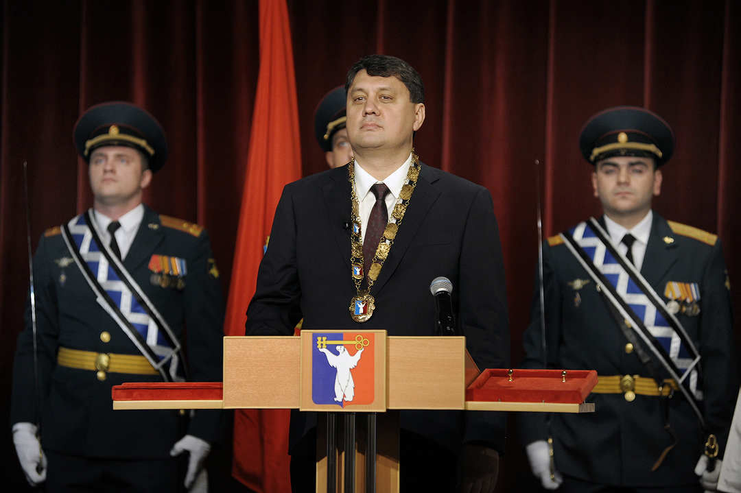 Ринат Ахметчин принял присягу, после чего председатель городского Совета депутатов Александр Пестряков вручил ему знак главы города.