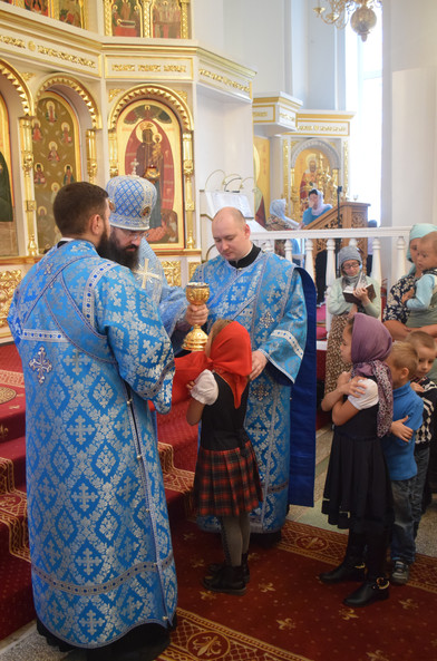В завершении богослужения Архипастырь совершил молебен и благословил учащихся воскресной школы при кафедральном соборе города Норильска, у которых в этот день начались первые занятия в этом учебном году.