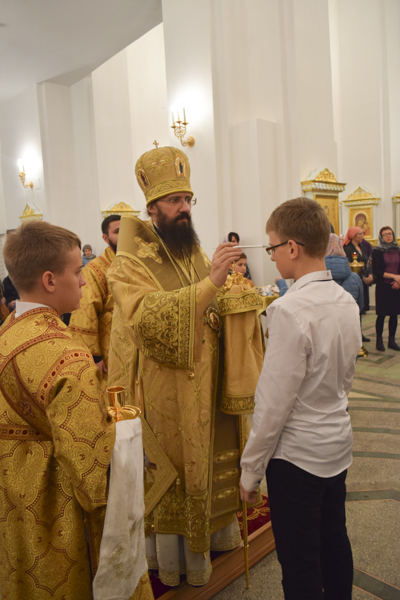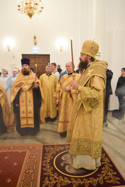 Его Преосвященству сослужили: секретарь Норильской епархии иеромонах Герман (Мельников); клирик храма пророка Божия Илии на бывшем Новгородском подворье города Москвы протоиерей Александр Курнасов; духовенство кафедрального собора.