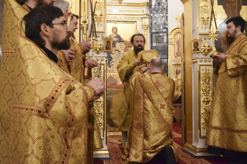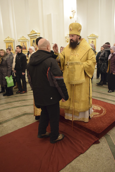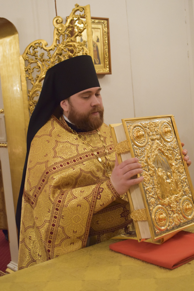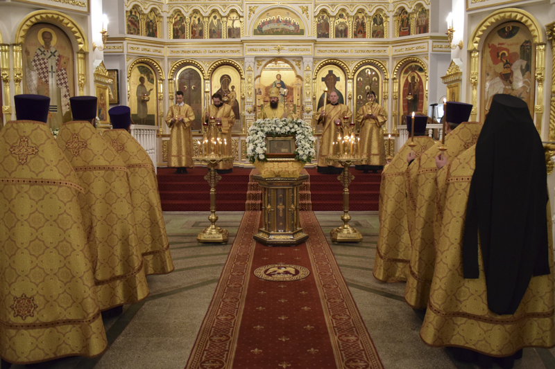 После Причастия епископ Агафангел в сослужении духовенства совершил славление перед иконой святителя Николая и обратился к верующим со словами проповеди.