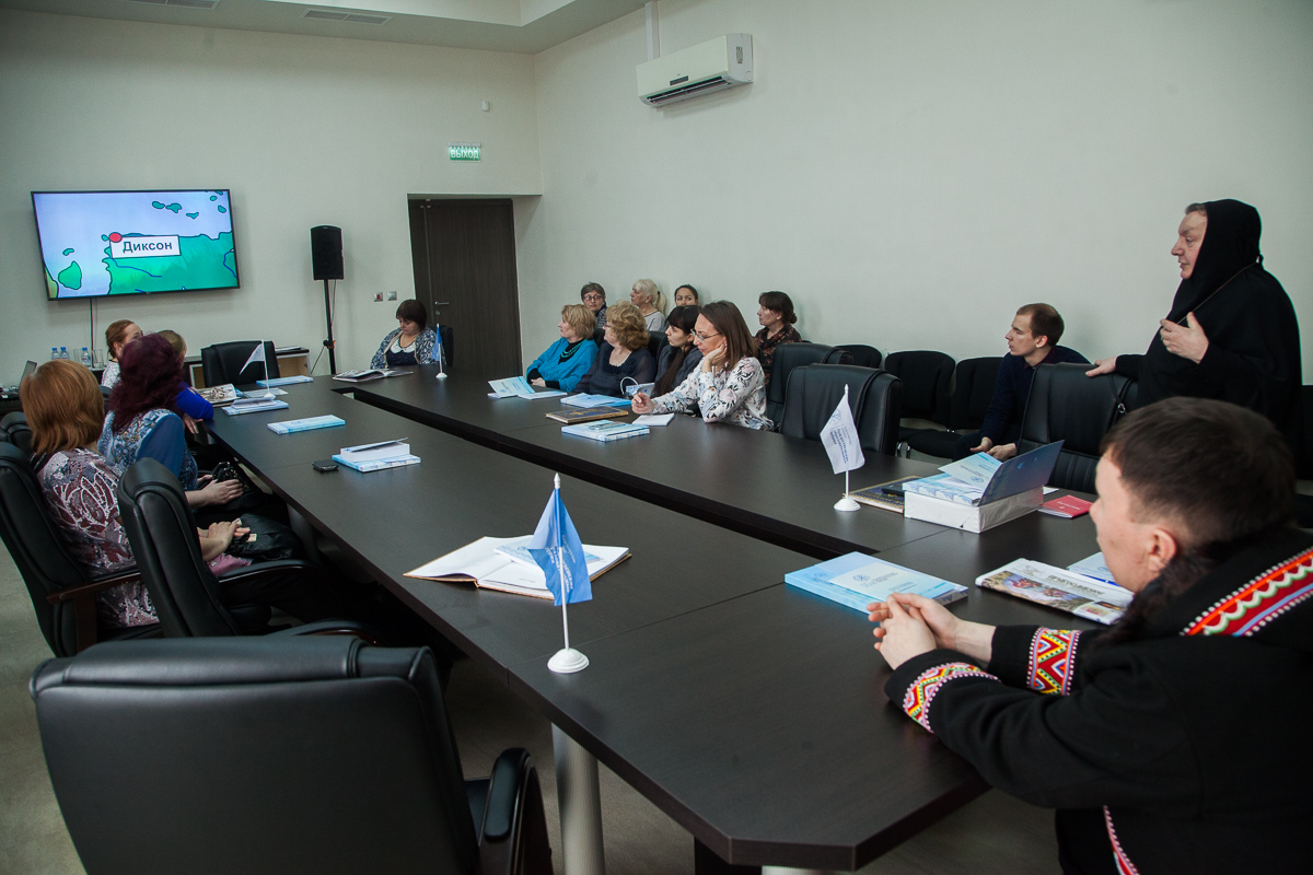 Матушка Илариона познакомила участников с книгой и рассказала об истории создания, отметив, что главной задачей является «сохранение „жемчужины «национального долганского языка, его культурных особенностей и традиций».