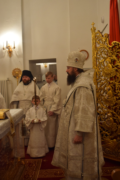По окончании Божественной литургии Владыка Агафангел в сослужении духовенства совершил славление перед иконой праздника Крещения Господня.