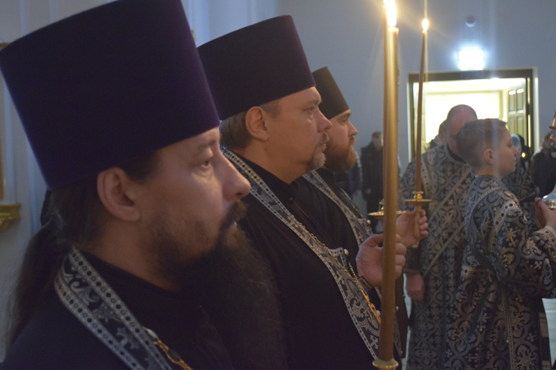 Его Преосвященству сослужили: секретарь Норильской епархии иеромонах Герман (Мельников); благочинный Норильского округа протоиерей Владимир Иванов; председатель епархиального отдела по взаимодействию с ВС РФ протоиерей Димитрий Харцыз; штатное духовенство кафедрального собора.