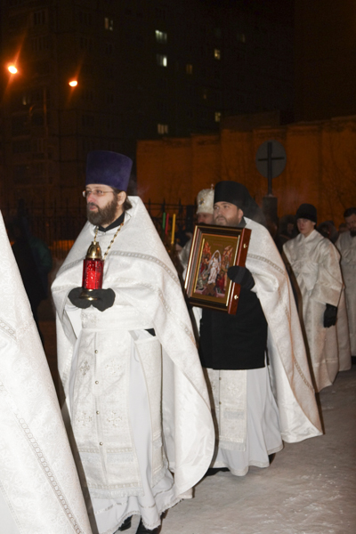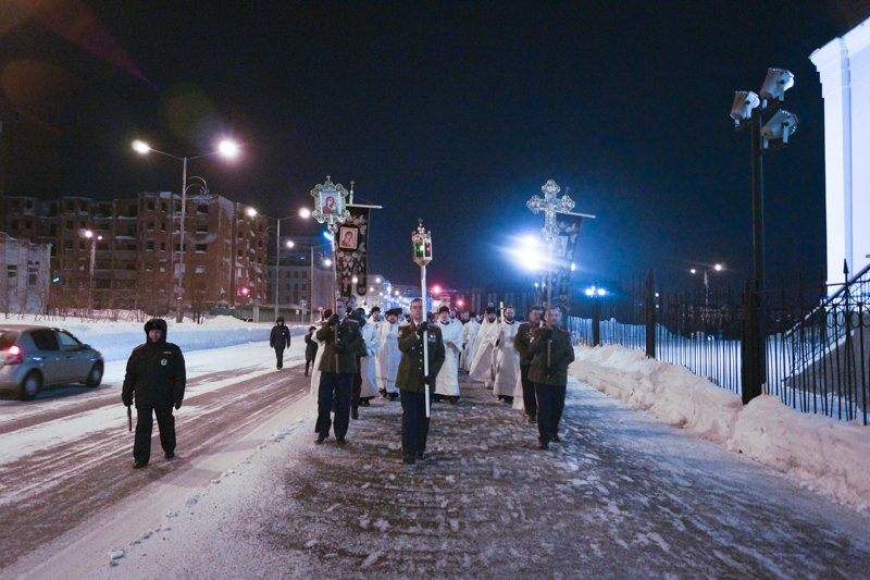 Под пение стихиры «Воскресение Твое, Христе Спасе» был совершен крестный ход вокруг кафедрального собора города Норильска.