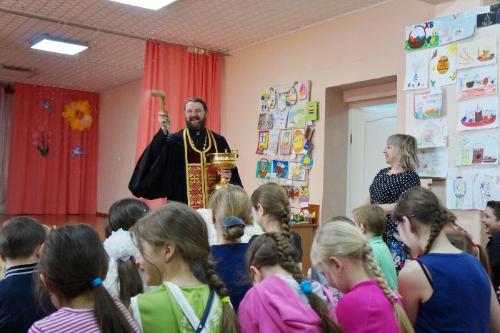 Ребята поприсутствовали на праздничном водосвятном молебне, послушали Пасхальные песнопения.
