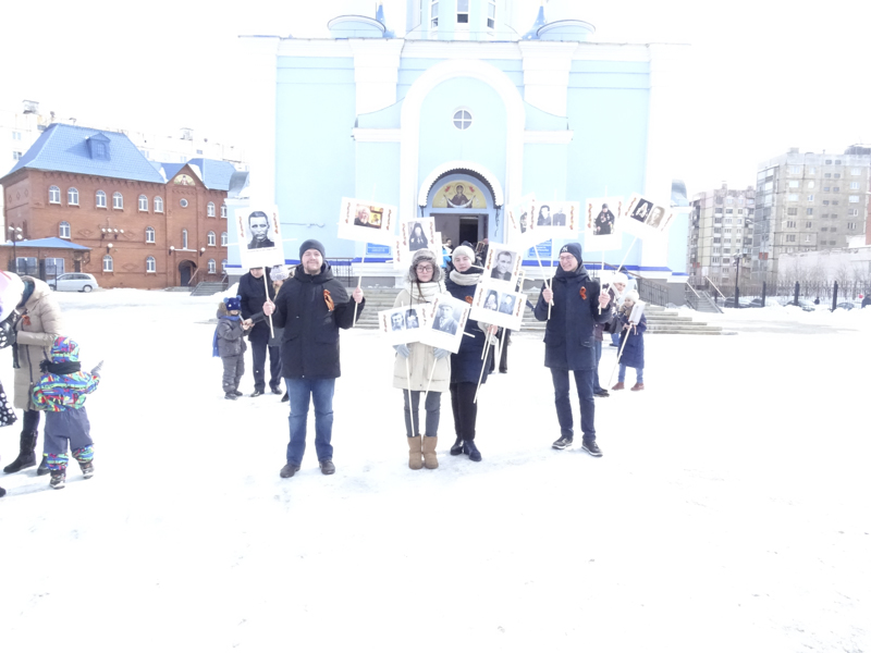 Православная молодежь взяв портреты почивших священнослужителей, участвовавших в Великой Отечественной Войне присоеденилась к общегородской колонне, которая растянулась на 3 киллометра. Маршрут «Бессмертного полка» пролегал мимо кафедрального собора, который встречал верных сынов Отечества пасхальным колокольным звоном.