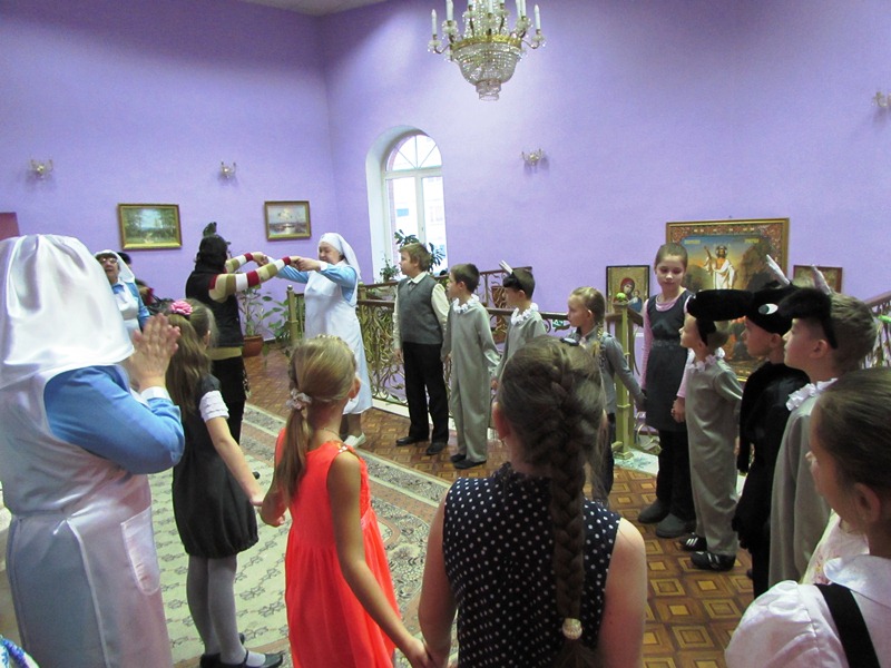 Концерт открыла семья священника Алексия Пирогова. Родители вместе с пятью младшими детишками исполнили лирическую песню о матери. Певцов и танцоров, сменили маленькие артисты, которые сыграли спектакль «Волк и семеро козлят» с новым текстом, который конечно же делал героем старой сказки маму и любовь к ней ее детишек.