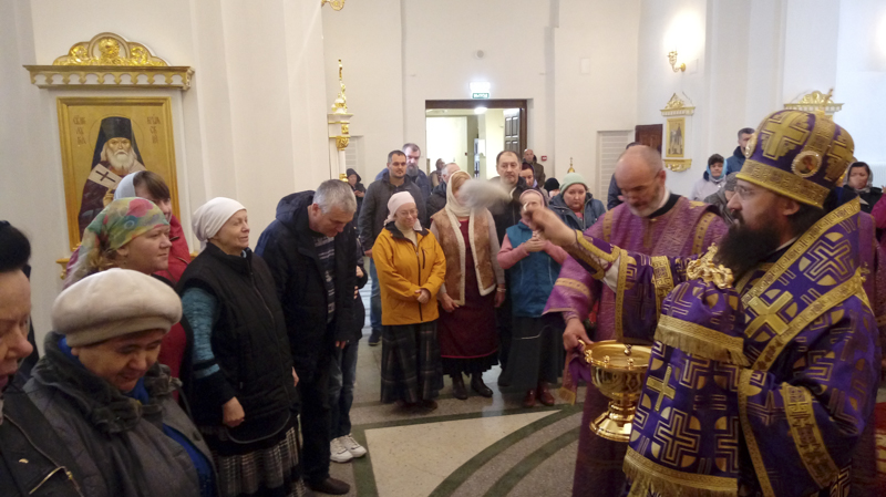 Его Преосвященству сослужили: секретарь Норильской епархии иеромонах Герман (Мельников); руководитель епархиального отдела по церковной благотворительности и социальному служению иерей Сергий андреев; руководитель епархиального отдела по делам молодежи иерей Димитрий Прохоров; штатный клир собора.