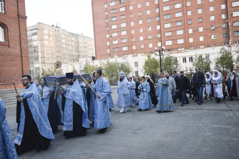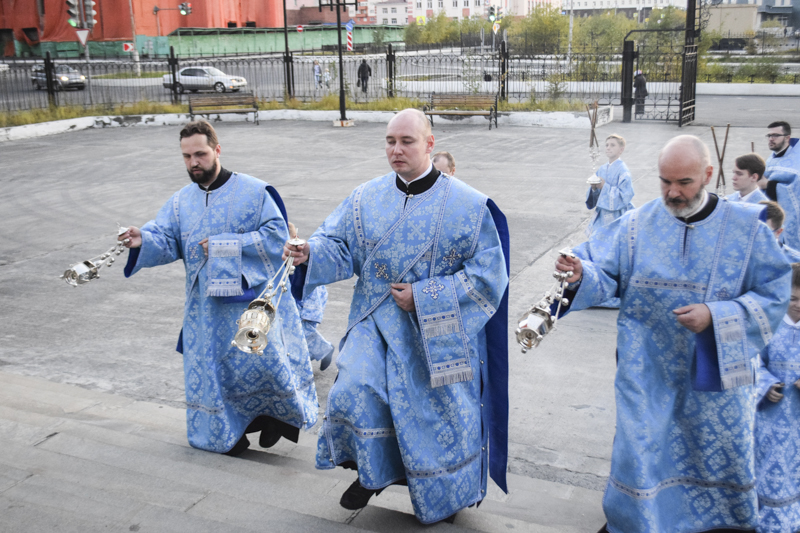 Его Преосвященству сослужили: секретарь Норильской епархии иеромонах Герман (Мельников); ключарь кафедрального собора иерей Алексий Пирогов; руководитель отдела Норильской епархии по церковной благотворительности и социальному служению иерей Сергий Андреев; руководитель епархиального отдела по делам молодежи иерей Димитрий Прохоров; штатный клир собора.