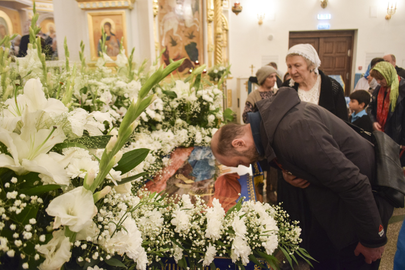 После Великого славословия священнослужители, взяв Плащаницу под пение заупокойного «Святый Боже…» обнесли её вокруг храма. По окончании крестного хода Владыка Агафангел помазал верующих освященным елеем.