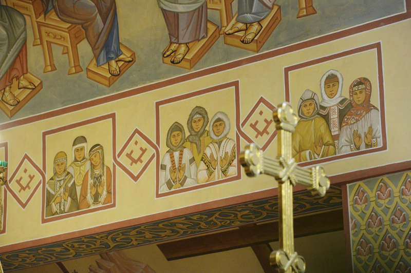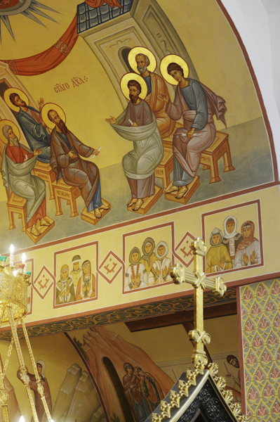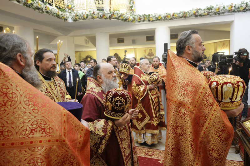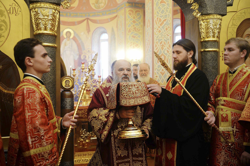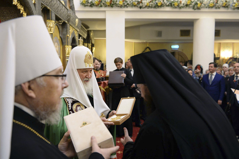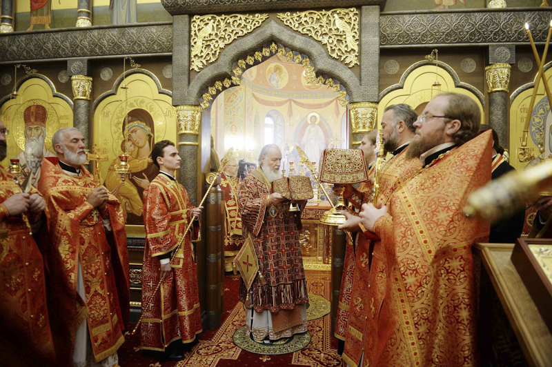 По окончании Литургии епископ Норильский и Туруханский Агафангел приветствовал Святейшего Владыку и преподнес Его Святейшеству икону Новомучеников и исповедников Церкви Русской, чей подвиг связан с Норильской землей.