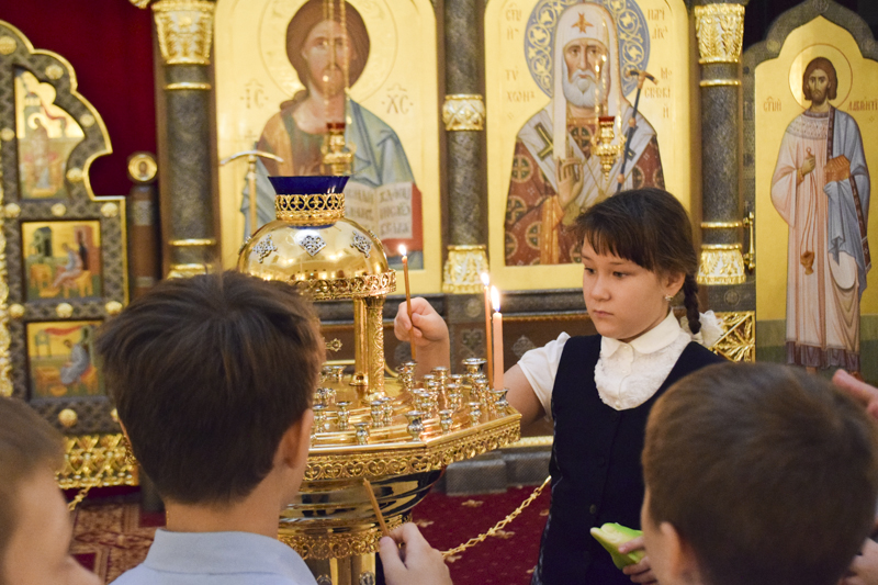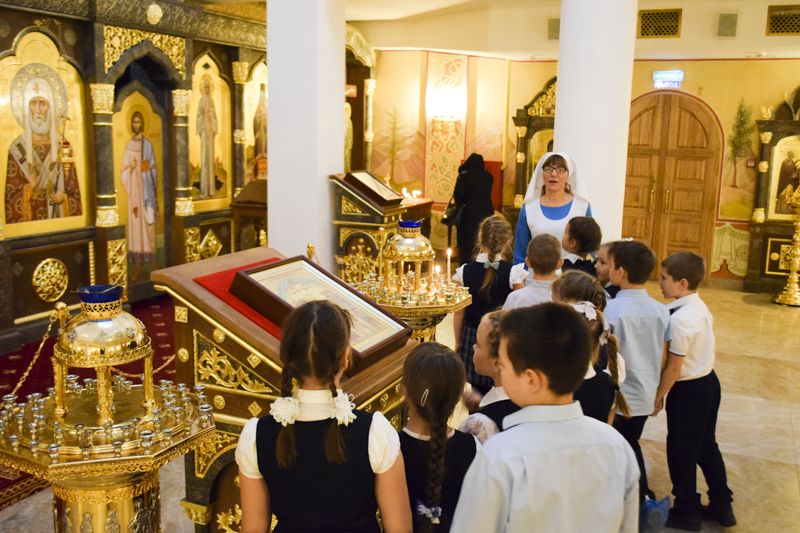 Сестры Милосердия рассказали детям о житии святой княгини Елисаветы, основании Марфо-Мариинского монастыря в г. Москве и провели экскурсию по храму новомучеников и исповедников Церкви Русской с рассказом об устройстве храма и правилах поведения в нем.