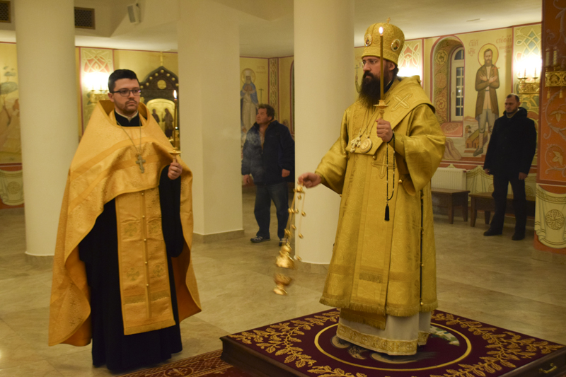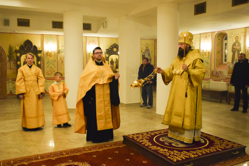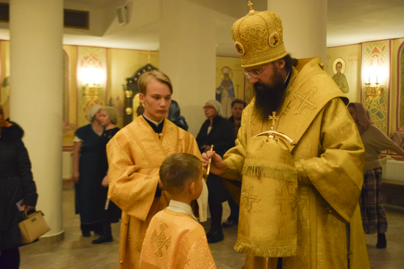 Его Преосвященству сослужили: ключарь кафедрального собора в честь иконы Божией Матери «Всех скорбящих Радость» г. Норильска иерей Алексий Пирогов; руководитель епархиального отдела по делам молодежи Норильской епархии иерей Димитрий Прохоров.