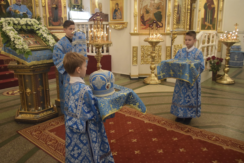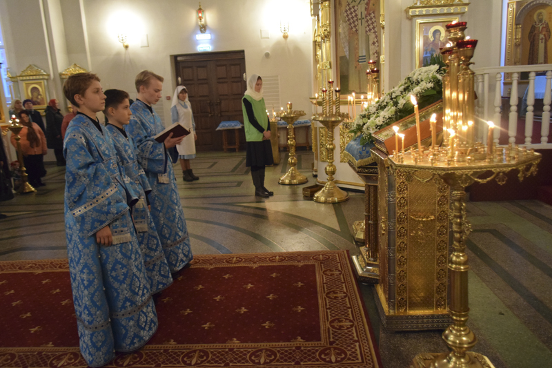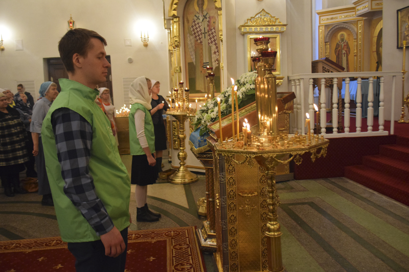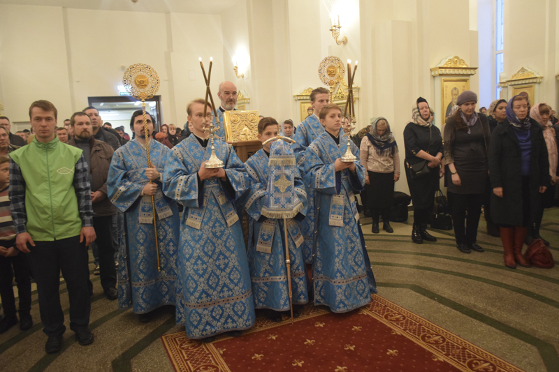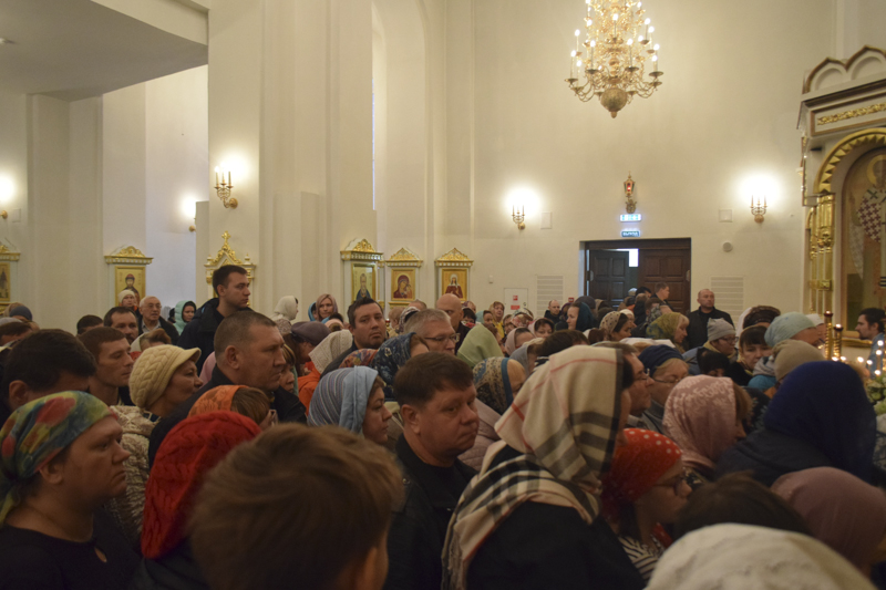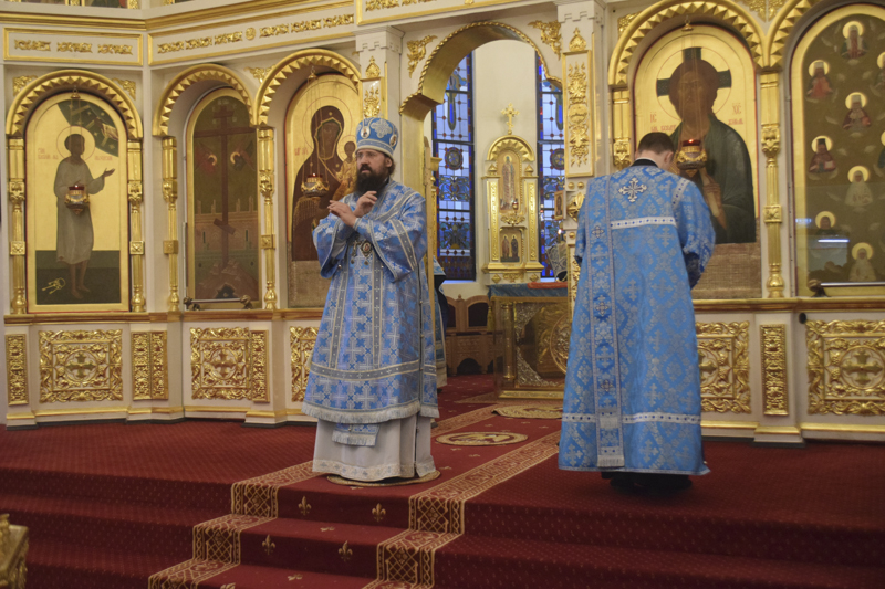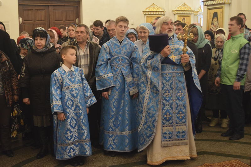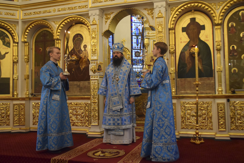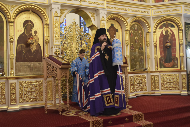 Его Преосвященству сослужили: благочинный Норильского округа протоиерей Владимир Иванов; ключарь кафедрального собора иерей Алексий Пирогов; соборное духовенство.