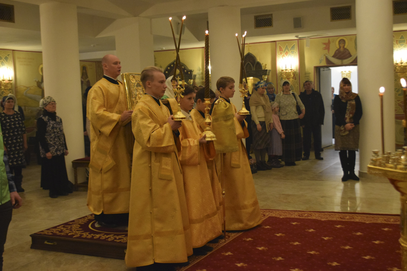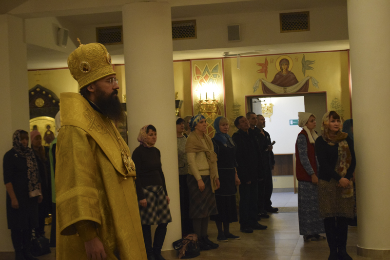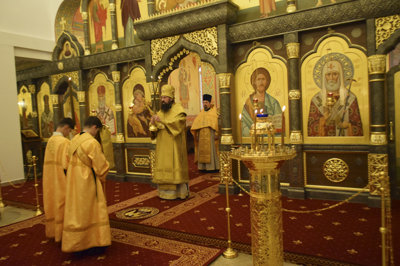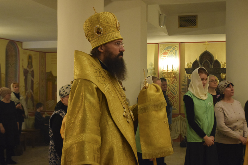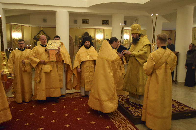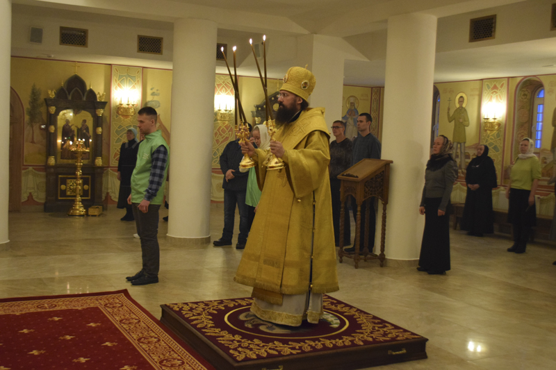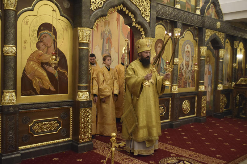 На кануне Архипастырь совершил Всенощное бдение в кафедральном соборе в честь иконы Божией Матери «Всех скорбящих Радость" города Норильска в сослужении соборного духовенства.