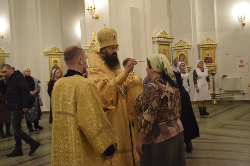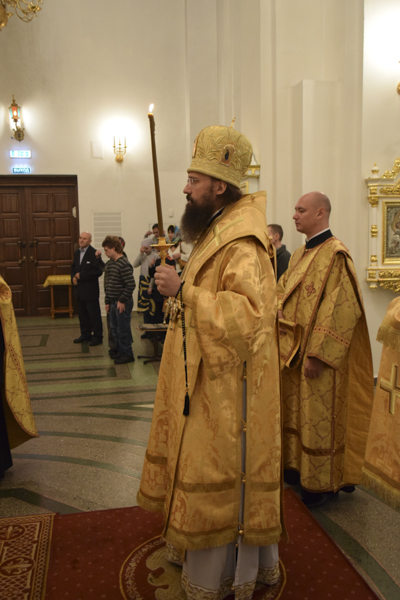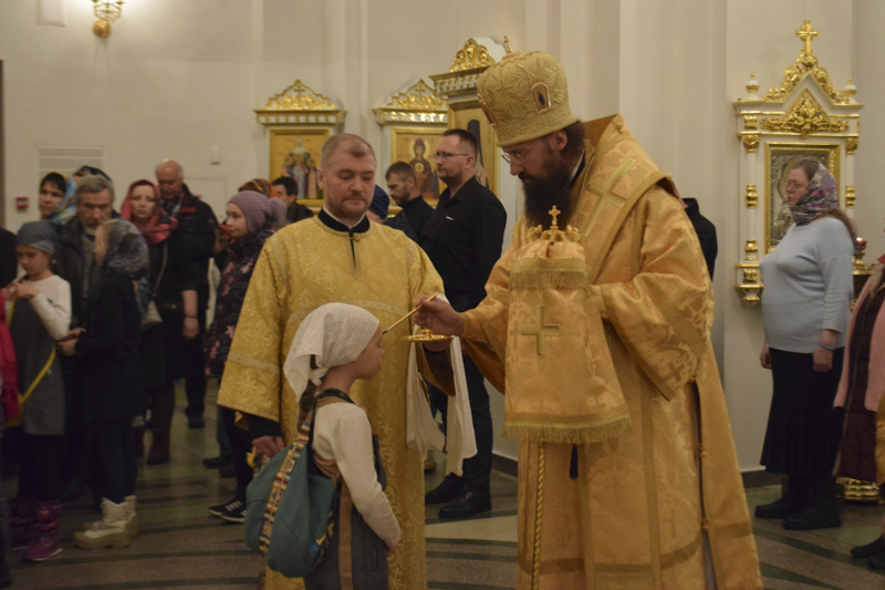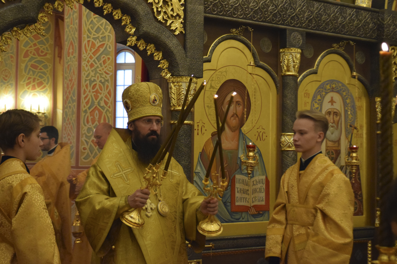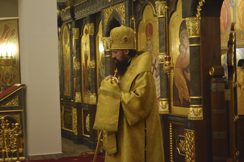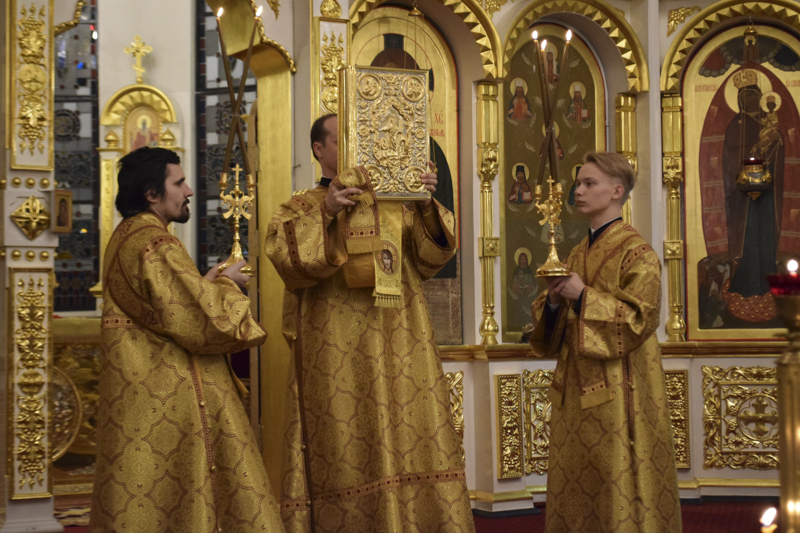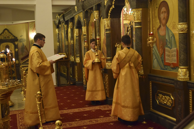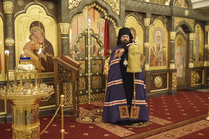 На кануне Архипастырь совершил Всенощное бдение в кафедральном соборе в честь иконы Божией Матери «Всех скорбящих Радость" города Норильска в сослужении соборного духовенства.