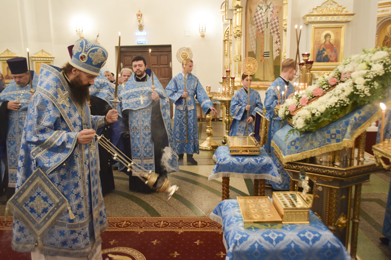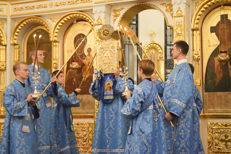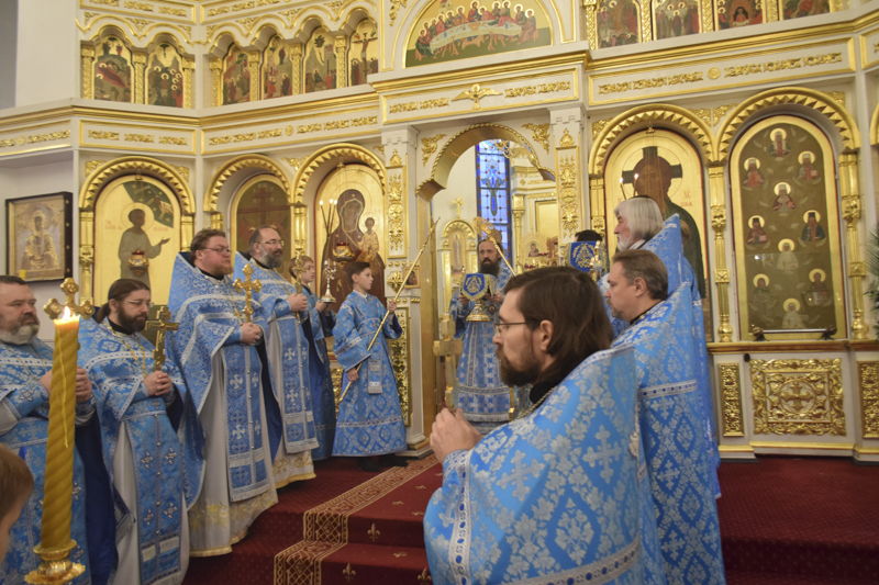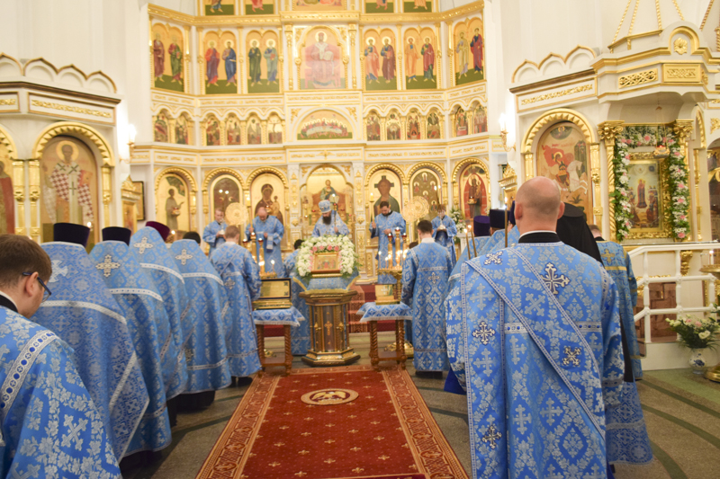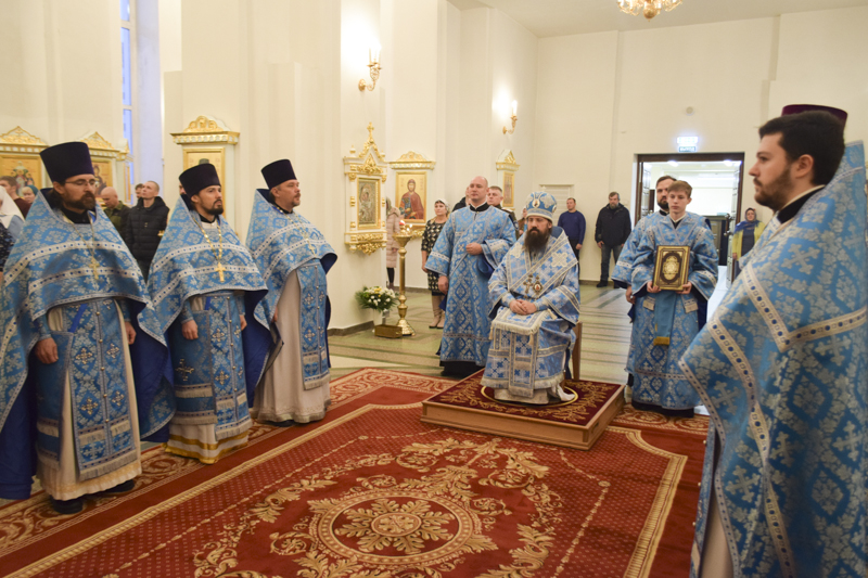 После причастия мирян Архипастырь в сослужении духовенства совершили славление перед храмовой иконой Божией Матери "Всех скорбящих Радость".