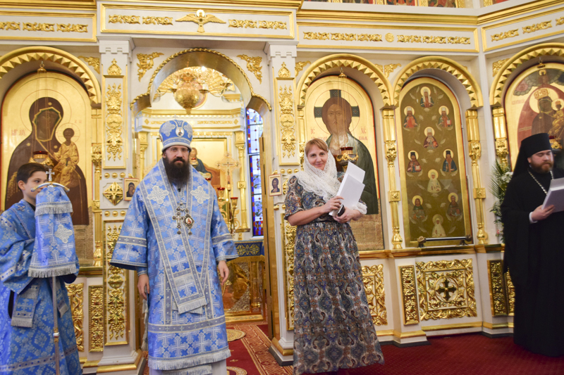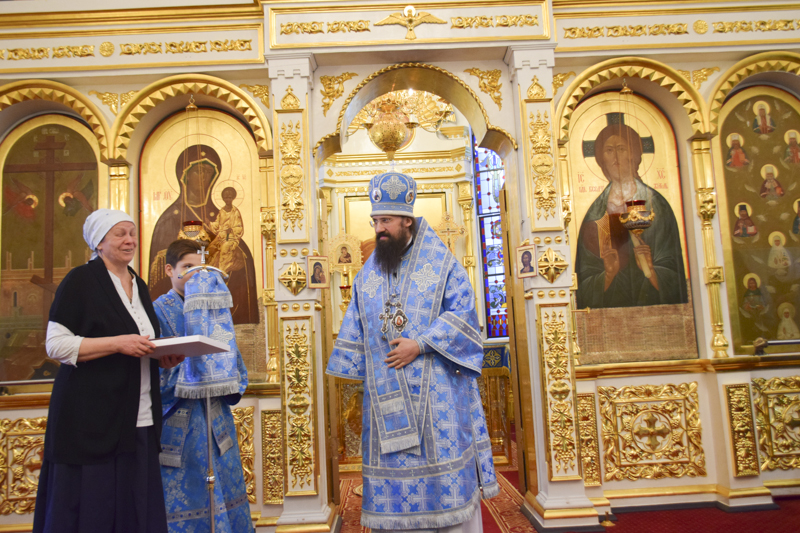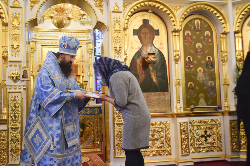 В конце Богослужения епископ Агафангел обратился к собравшимся с поздравительным словом и удостоил особо потрудившихся прихожан собора высоких епархиальных наград.