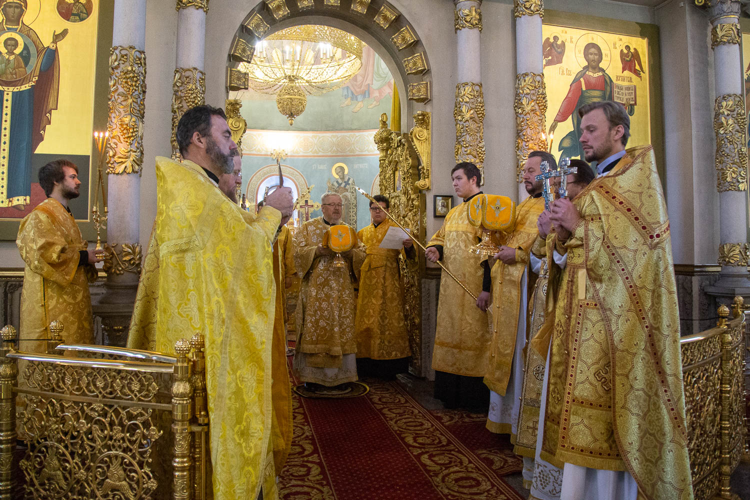 За Литургией архиереям сослужили: руководитель Административного секретариата Красноярской епархии, настоятель Покровского кафедрального собора Красноярска митрофорный протоиерей Владимир Дорош; исполняющий обязанности секретаря Красноярской епархии, благочинный церквей Левобережного городского округа Красноярска, наместник красноярского Успенского мужского монастыря игумен Иннокентий (Нилов); заведующий канцелярией Красноярской епархии, благочинный церквей Красноярского округа, настоятель Иоанно-Предтеченского храма города Красноярска протоиерей Николай Ши-кэ-мин; благочинный церквей Ачинского округа, настоятель Казанского собора города Ачинска митрофорный протоиерей Евгений Фролов, благочинный церквей Правобережного городского округа Красноярска, настоятель красноярского храма Рождества Христова протоиерей Максим Смоляков; благочинный церквей Минусинского округа, настоятель Спасского собора города Минусинска протоиерей Евгений Нещерет; благочинный церквей Шарыповского округа, настоятель Свято-Троицкого храма города Шарыпово протоиерей Павел Фролов; благочинный церквей Назаровского округа, настоятель Покровского храма города Назарово протоиерей Роман Нещерет; благочинный церквей Березовского округа, настоятель Введенского храма поселка Березовка иерей Вячеслав Комаров; настоятели и штатные священнослужители храмов города Красноярска.