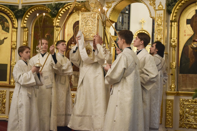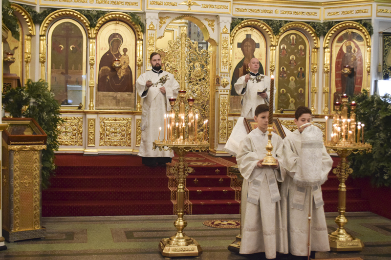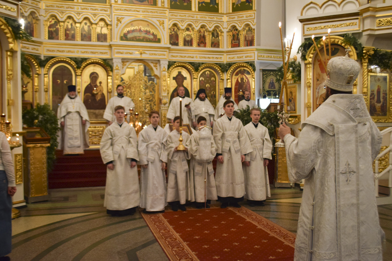 По отпусте великой вечерни перед рождественской свечой, символизирующей Вифлеемскую звезду, были пропеты тропарь и кондак праздника Рождества Христова.