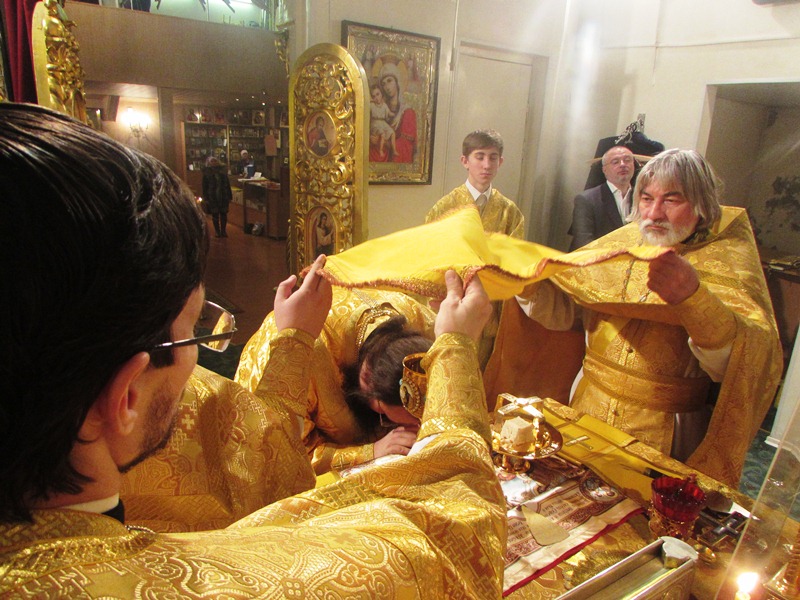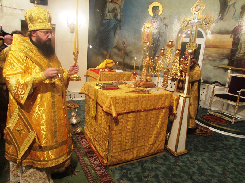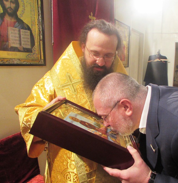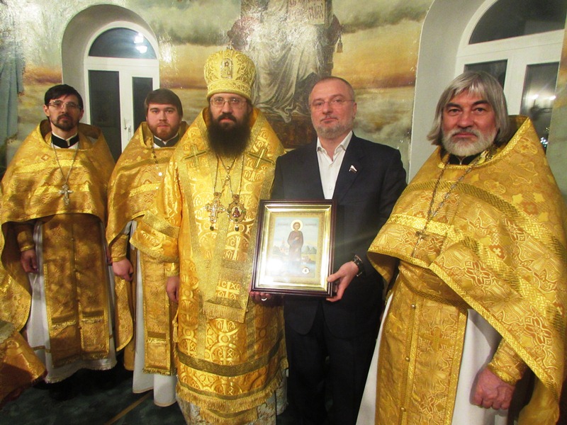 По окончании Божественной литургии Владыка Агафангел поздравил Андрея Александровича с днем тезоименитства и преподнес ему в подарок икону мученика Василия Мангазейского с частицей мощей святого.