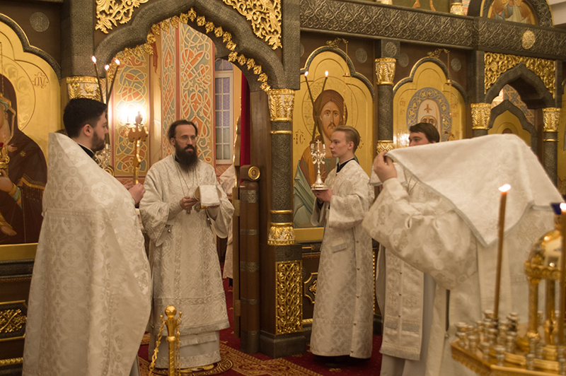 Его Преосвященству сослужили: секретарь Норильской епархии иеромонах Герман (Мельников); руководитель отдела Норильской епархии по делам молодежи иерей Димитрий Прохоров.