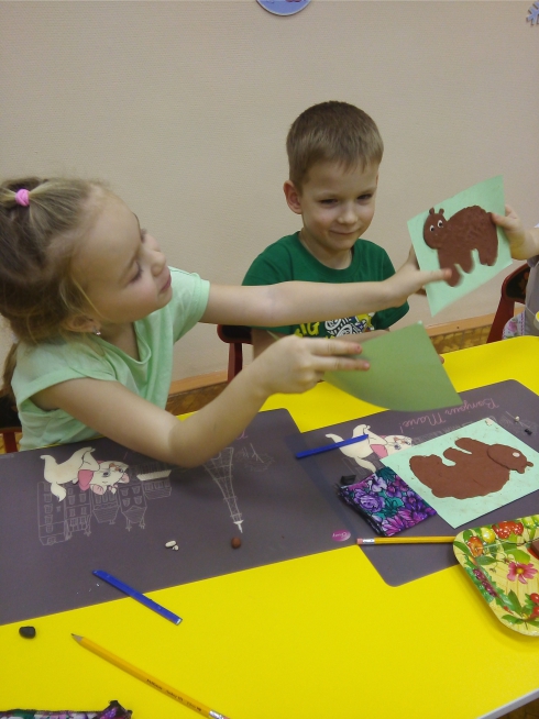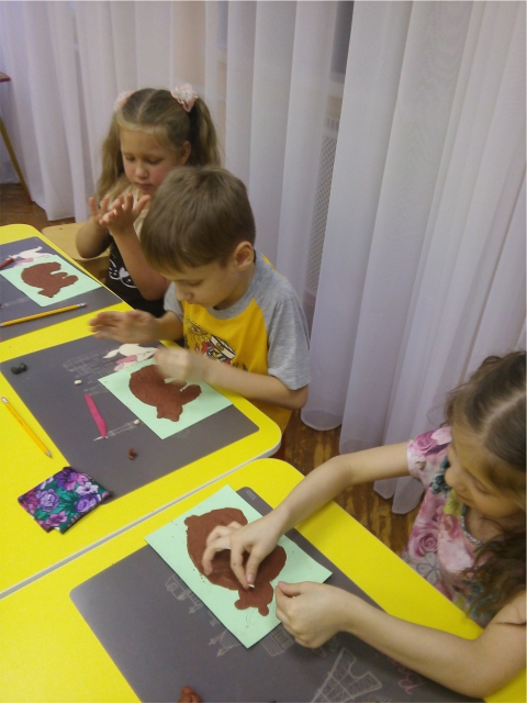 Под руководством Финько Елены Игоревны дошкольники выполнили скульптуру на плоскости - слепили из пластилина фигуру медведя.