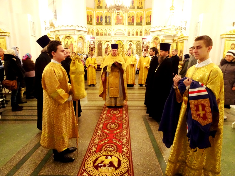 Архипастырю сослужили: исполняющий обязанности секретаря Норильской епархии иеромонах Герман (Мельников), благочинный Норильского округа и ключарь кафедрального собора протоиерей Владимир Иванов, председатель епархиального отдела по взаимодействию с вооруженными силами протоиерей Димитрий Харцыз, клирики кафедрального собора.
