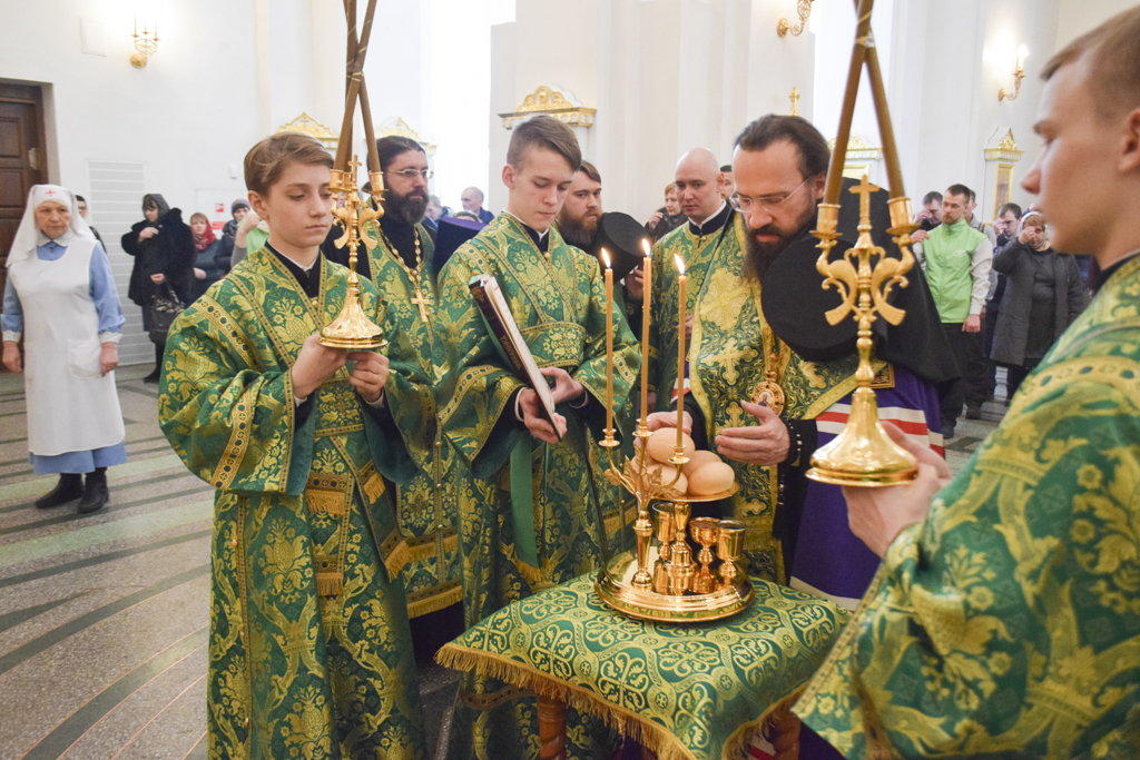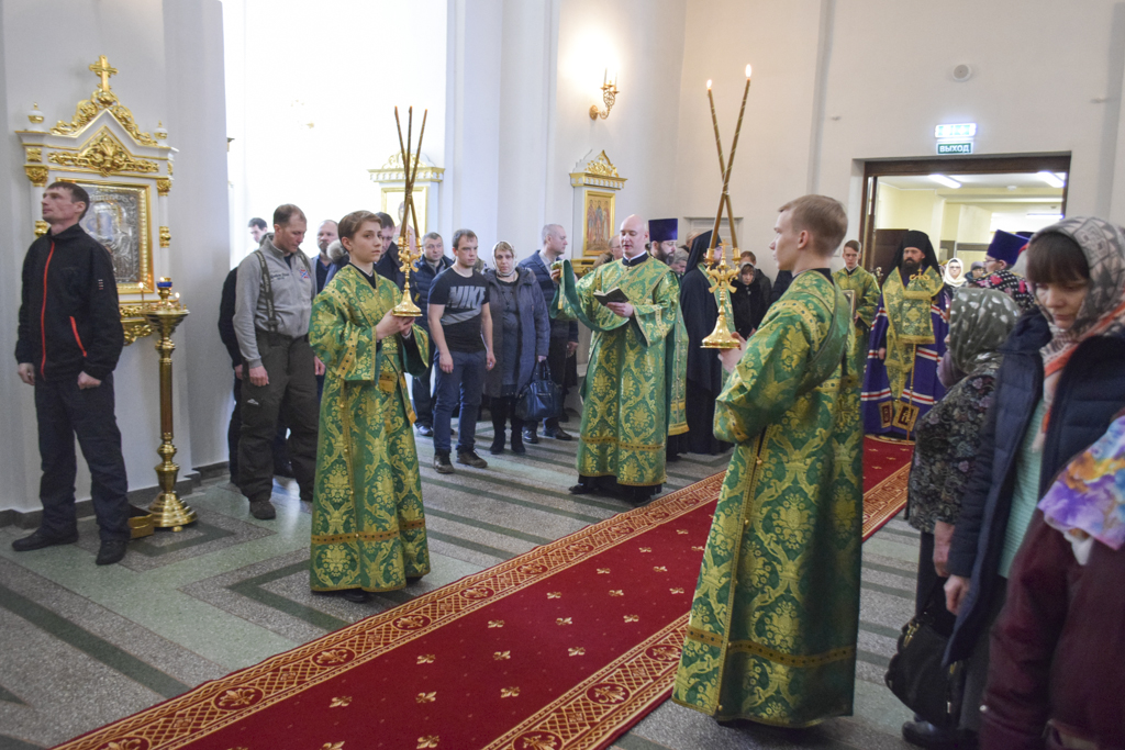 Его Преосвященству сослужили: секретарь Норильской епархии иеромонах Герман (Мельников); благочинный Норильского округа протоиерей Владимир Иванов; ключарь кафедрального собора иерей Алексий Пирогов; штатные клирики кафедрального собора.