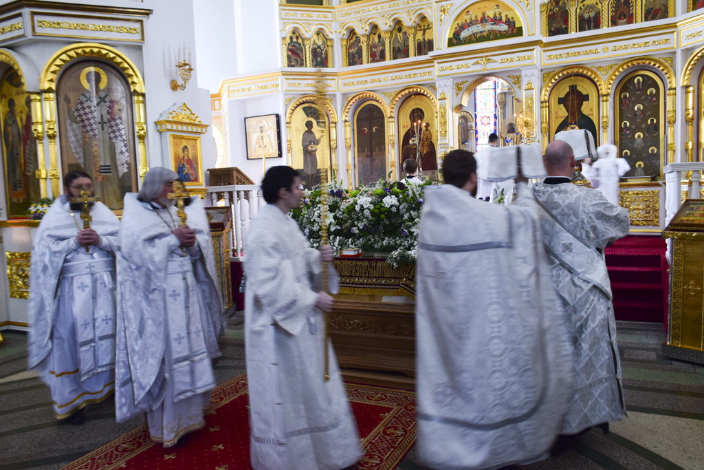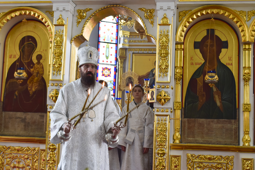 27 апреля 2019 года, Великая Суббота, Преосвященнейший агафангел, епископ Норильский и Туруханский совершил вечерню и Божественную литургию святителя Василия Великого в кафедральном соборе в честь иконы "Божией Матери "Всех скорбящих Радость" города Норильска.