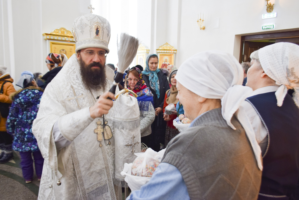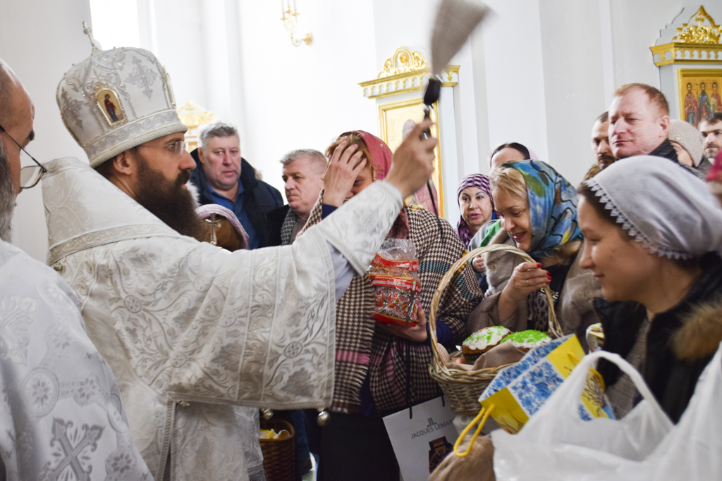 По заамвонной молитве Архипастырь совершил освящение хлеба и вина. Также Владыка освятил пасхальную снедь.