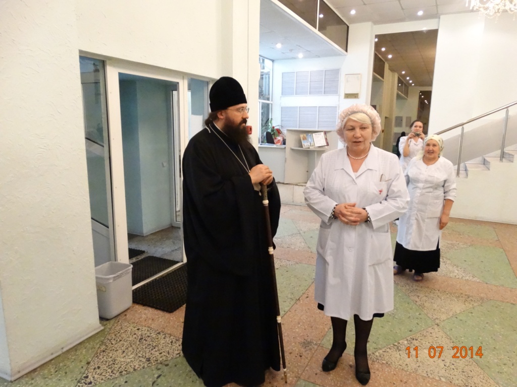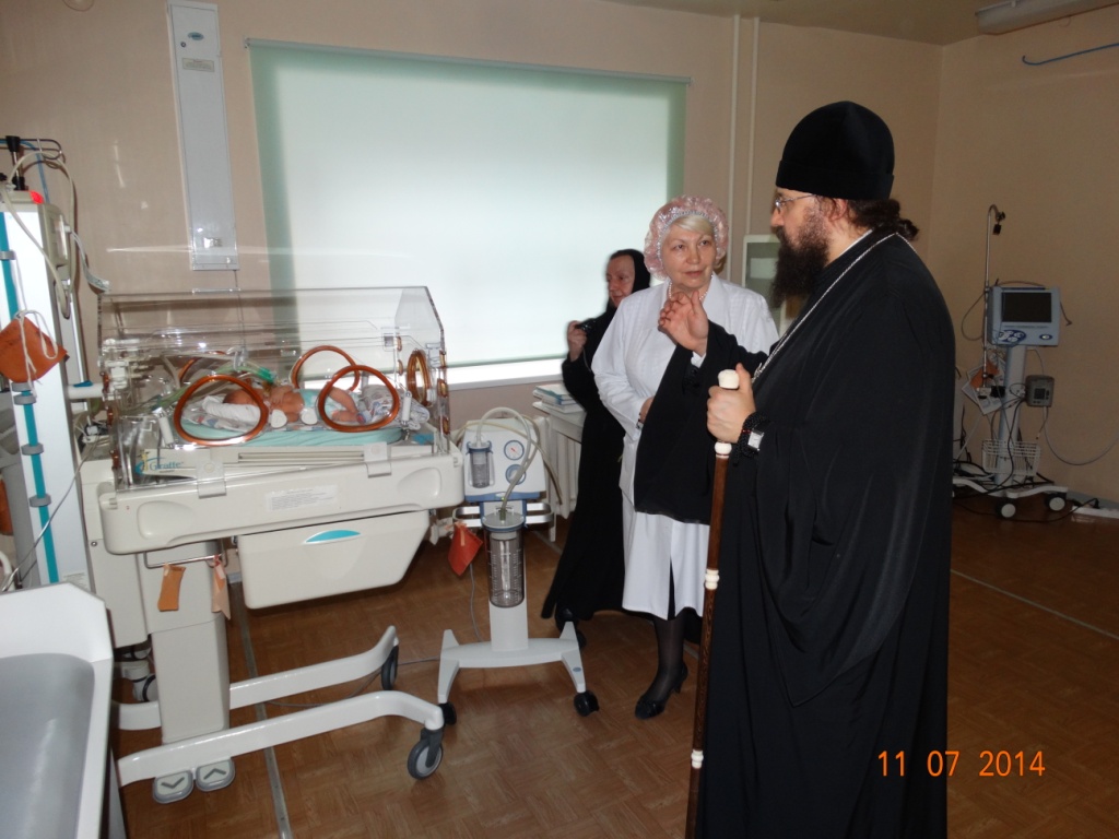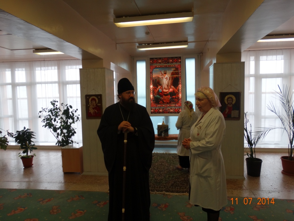 В этот же день Преосвященный Владыка посетил часовню в честь равноапостольной княгини Ольги в Родильном доме. При входе в здание роддома епископа Агафангела встретила главный врач – Ласточкина Татьяна Владимировна, которая познакомила Епископа с деятельностью МБЗУ.