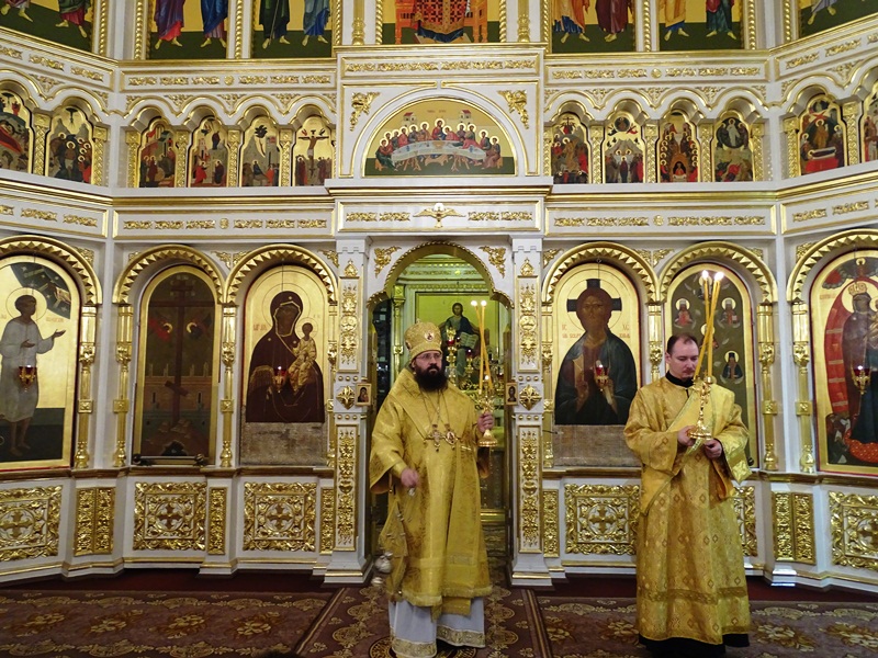 Перосвященнейшему Владыке сослужили: исполняющий обязанности секретаря Норильской епархии иеромонах Герман (Мельников), благочинный Норильского округа и ключарь собора протоиерей Владимир Иванов, председатель епархиального отдела по взаимодействию с ВС РФ протоиерей Димитрий Харцыз, клир собора.