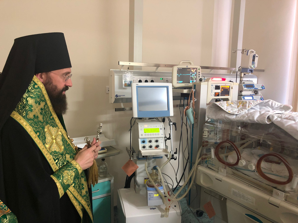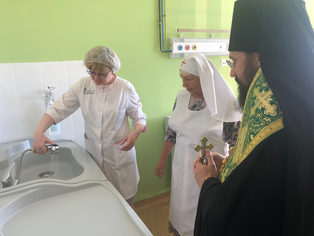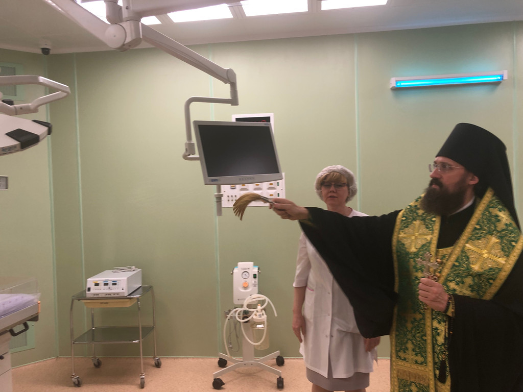 В сопровождении медицинского персонала священнослужители окропили помещения, палаты и операционные перинатального центра святой водой.