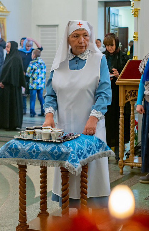 Его Преосвященству сослужили: секретарь Норильской епархии иеромонах Герман (Мельников); руководитель отдела Норильской епархии по церковной благотворительности и социальному служению иерей Сергий Андреев; штатный клир собора.