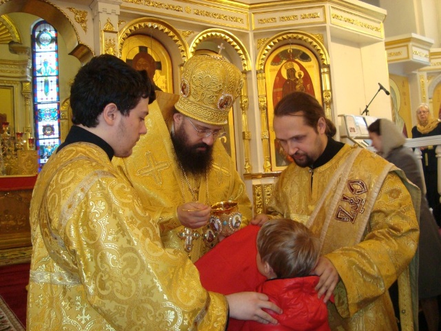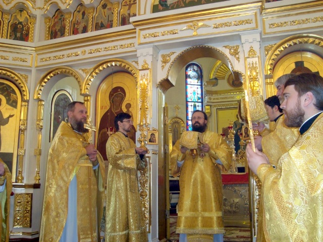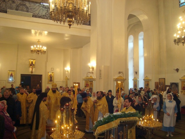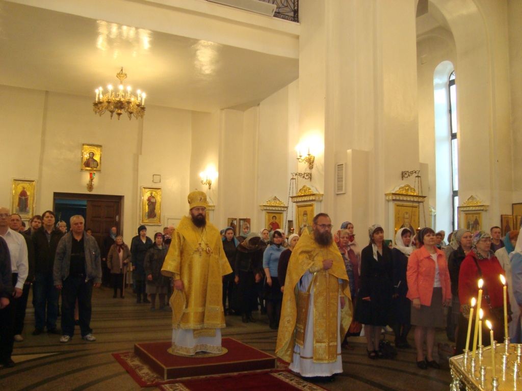 Его Преосвященству сослужили благочинный Норильского благочиния протоиерей Владимир Иванов, иерей Александр Попов настоятель храма Покрова Пресвятой Богородицы поселка Светлогорск, соборное духовенство.